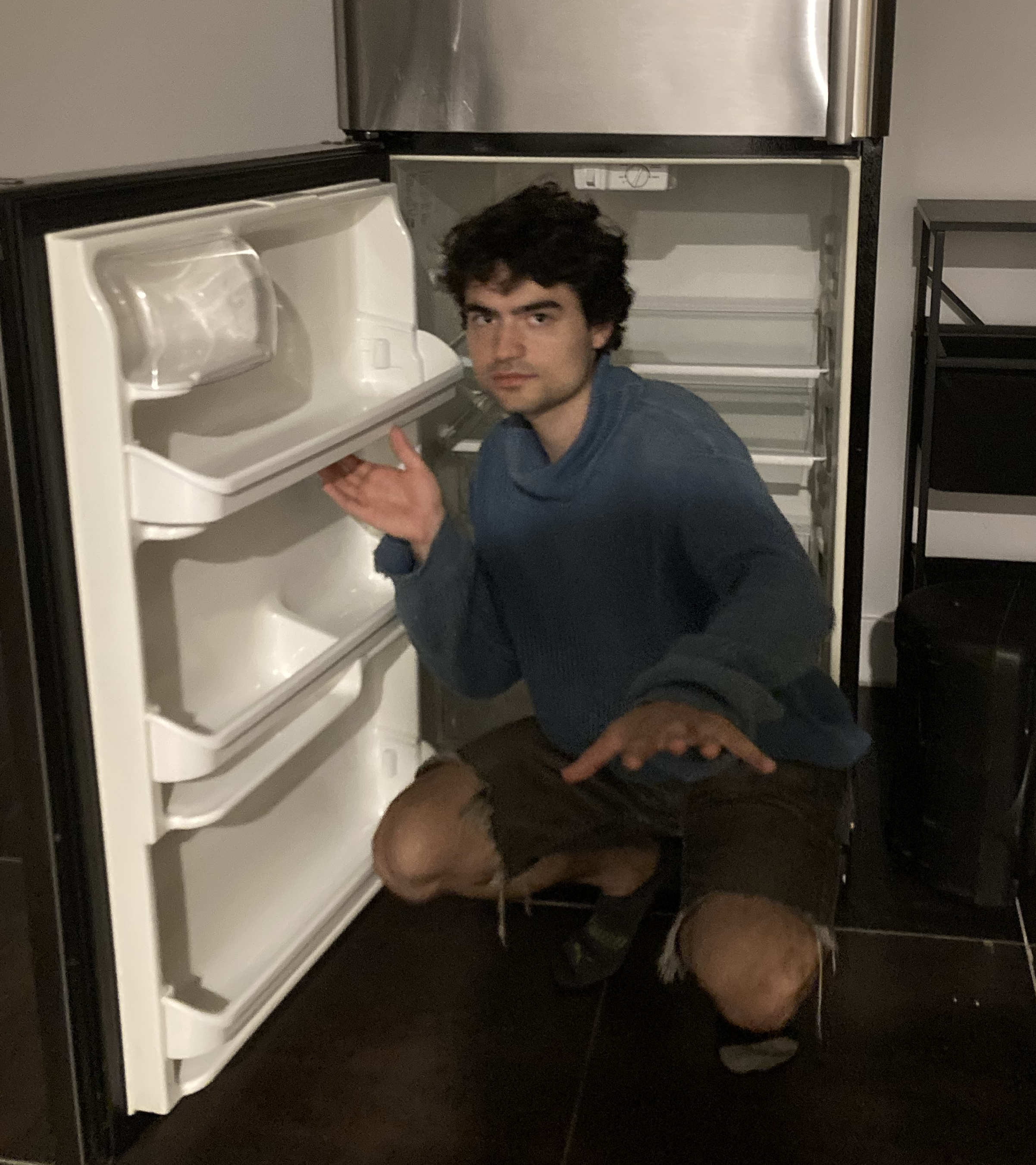 Hi! I'm a Brooklyn-based musician and theater artist. Thanks for visiting my website! I like making stuff that is fun and surprising, I'm interested in clown and devised theater. As a musician I play jazz piano and songwriter guitar and produce electronic tracks for theater and film. I have some solo acoustic music out as well. I love DIY and low-budget art and I put on shows in my basement in Bushwick. In my day jobs I work with kids as a substitute teacher, birthday clown, music facilitator, math team coach, etc. I have a masters in math and a data science background that I no longer associate with. You can hit me up on Instagram @god_yes or send me an email: . Here's me in a fridge: